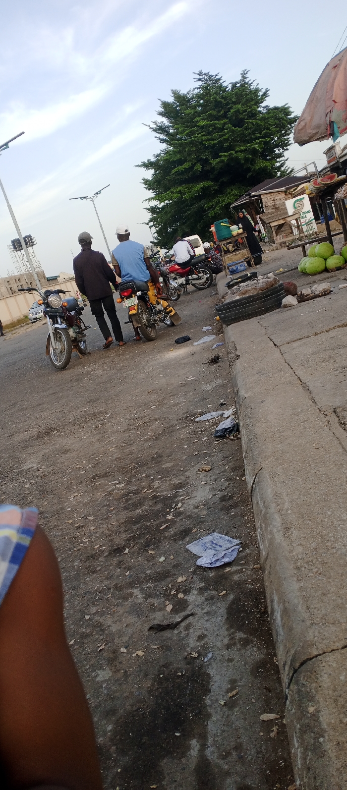 The image presents a daytime roadside scene in Lokoja, Nigeria, under a light blue sky with sparse, wispy clouds. In the immediate foreground, a partial view of a human arm and shoulder, clad in a blue and white plaid shirt, occupies the bottom-left corner. The ground consists of uneven dirt and gravel, heavily littered with crumpled paper, plastic bags, and other debris. A concrete curb defines the edge of this unpaved area along the right side of the frame. In the mid-ground, two adult males are positioned near motorcycles on the unpaved road. One male, wearing a dark shirt and a dark baseball cap, stands to the left of a dark-colored motorcycle with chrome elements. Another male, wearing a light blue t-shirt and a white baseball cap, is seated on a yellow motorcycle that displays a partially visible "KOJ" license plate on its rear fender and has its kickstand deployed. Further into the mid-ground on the right, several rudimentary market stalls constructed from wood are visible. One stall features a light-colored tarp canopy and displays a stack of green, spherical fruits. A partially visible green sign, bearing the text "GRAND ROYALE," is affixed to an adjacent stall. A person in a dark abaya-like garment stands near these stalls. Additional motorcycles, including a red one with a male rider in a white shirt, a white van, and a silver sedan, are present on the road further in the background. The background includes multiple modern streetlights equipped with solar panels. A large, dense green tree is prominent behind the market stalls, and a tall water tower or similar utility structure is visible on the far left. The scene depicts an active urban or semi-urban commercial thoroughfare with visible signs of ongoing human and vehicular activity, alongside noticeable environmental wear and refuse accumulation.