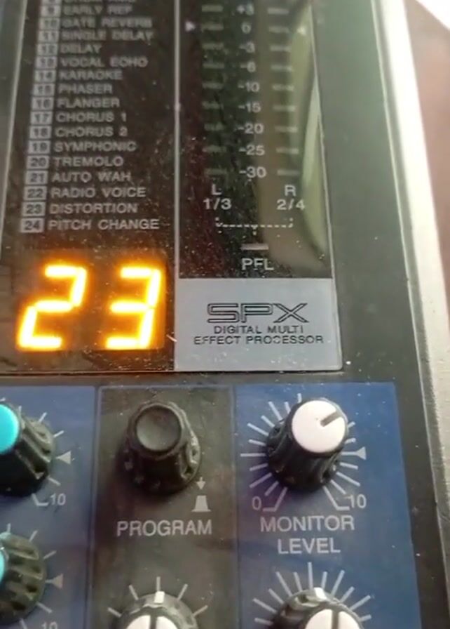 close-up of a Yamaha MG20XU mixing console. The display reads "23", and the label below says "SPX Digital Multi Effect Processor". There are several knobs visible including "Program" and "Monitor Level". The video is static.