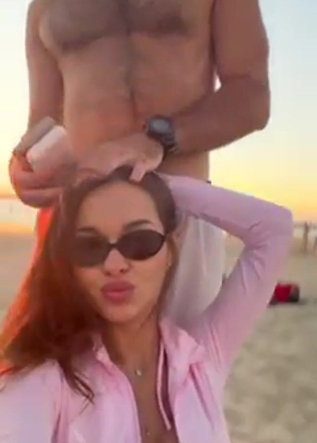 The video features a woman and a man on a beach. The woman is in the foreground, wearing sunglasses and a pink long-sleeved shirt that is zipped down slightly. The man stands behind her, shirtless, wearing white shorts and sunglasses. He briefly places his hand on her head. The beach and ocean are visible in the background, with other people visible in the distance. The lighting suggests it is near sunset. The woman looks at the camera and smiles. The man appears to be holding a phone or small device.