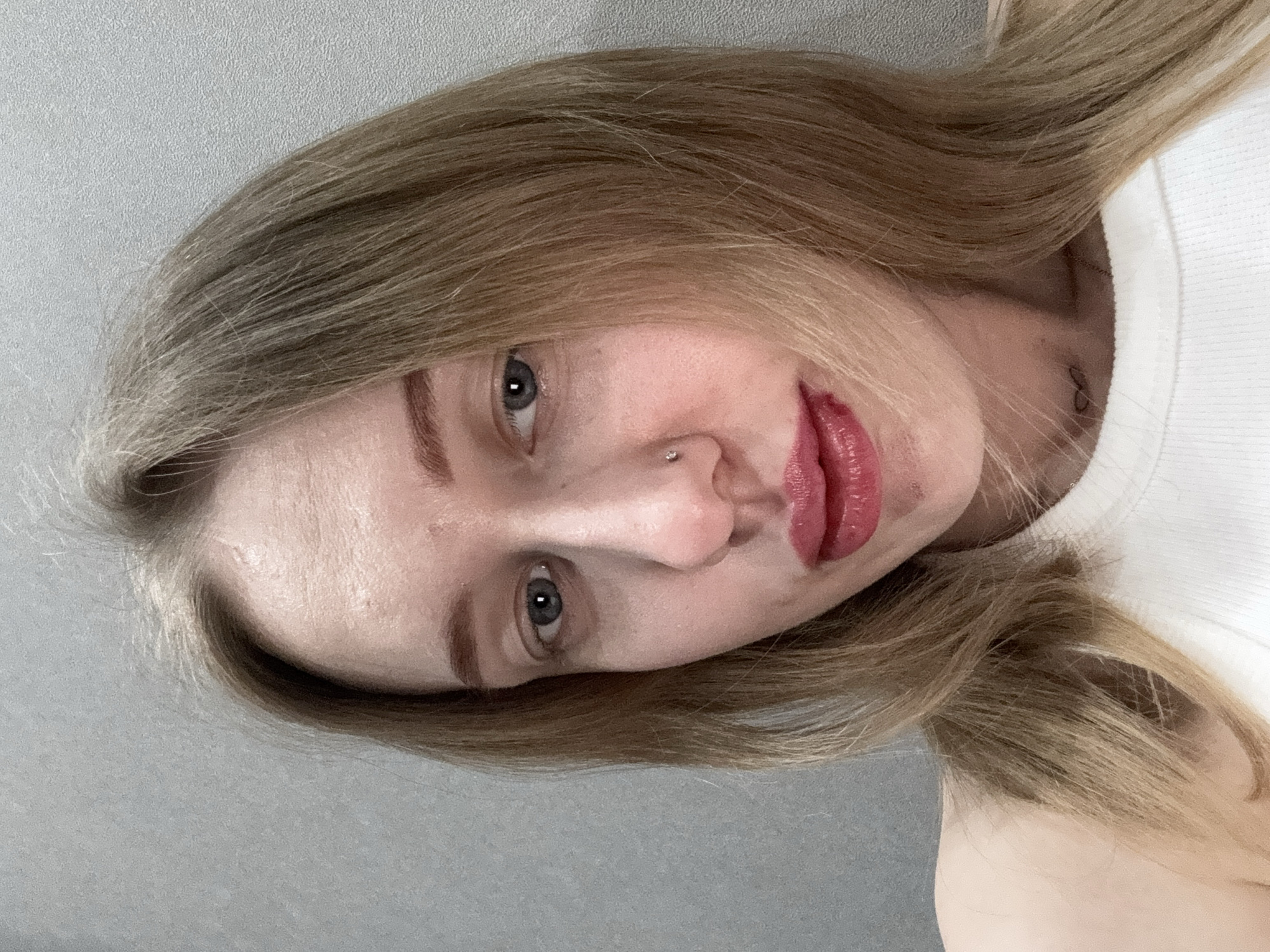 A close-up portrait depicts a fair-skinned female subject with light blonde hair and light-colored eyes, looking directly at the camera. A small silver-colored stud pierces the left nostril. Her lips are coated with a reddish-pink cosmetic, exhibiting a minor smudge on the lower lip. She is dressed in a white ribbed tank top, and a small black infinity symbol tattoo is visible on her left upper chest/lower neck area. The background consists of a plain, light grey textured wall, indicative of an indoor setting. No discernible features within the image enable the determination of its specific location within the city of Azov, Russia.