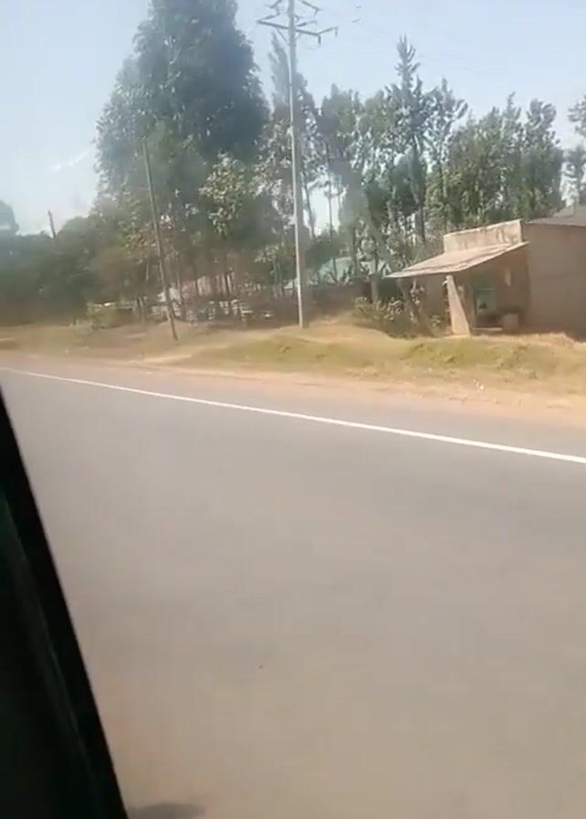 view from a moving vehicle, looking out the side window. A paved road stretches ahead, marked with a white line. The roadside is populated with trees, utility poles, and a few small buildings. Some people are standing and moving along the roadside. The weather appears sunny.