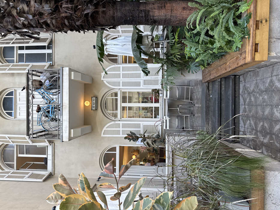 The shot shows an exterior view of a building with distinct architectural features, including arched windows with white shutters, a balcony housing a blue bicycle, and a light fixture illuminating a sign. The entrance is flanked by lush greenery, with plants spilling from a wooden planter box. Metal tables and chairs are arranged on the wet patio outside the building, suggesting a cafe or outdoor seating area. A palm tree looms above, adding a tropical touch to the scene.