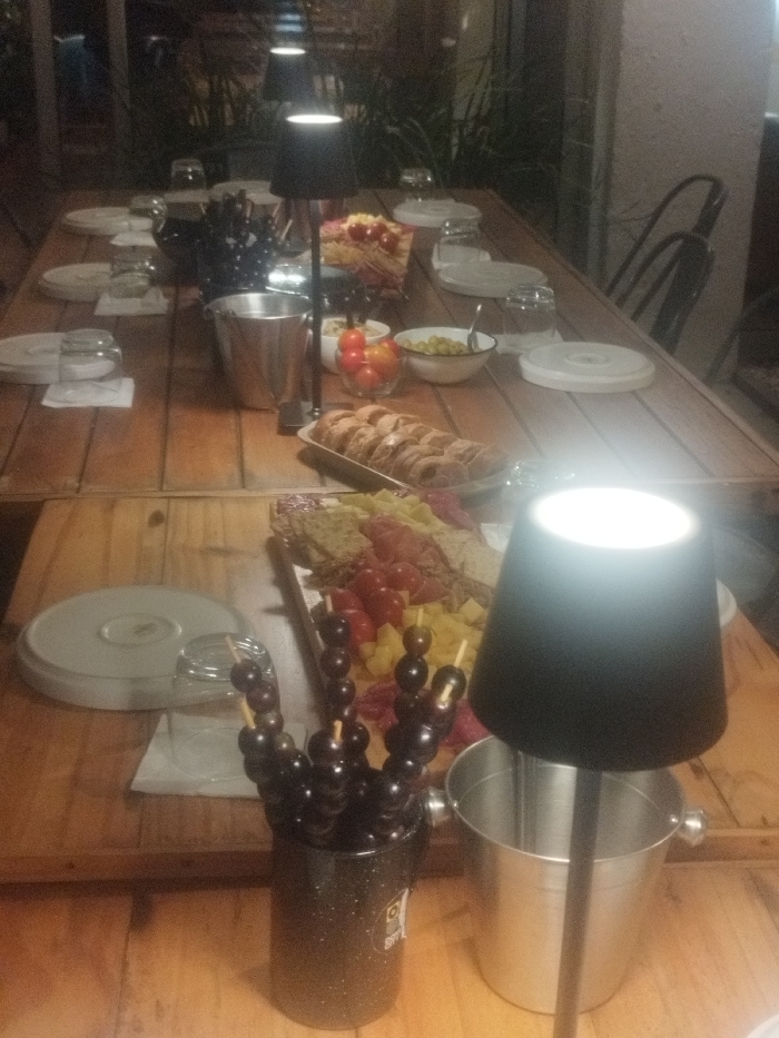 A long wooden table set for a meal displays plates, glasses, and several food arrangements. Skewered grapes in a mug, a charcuterie board with tomatoes and cheese, and bowls containing tomatoes and olives are visible. Mini sausage rolls are also placed along the table. Small black lamps provide lighting along the table. Chairs are present around the table, suggesting a ready-to-eat setup.