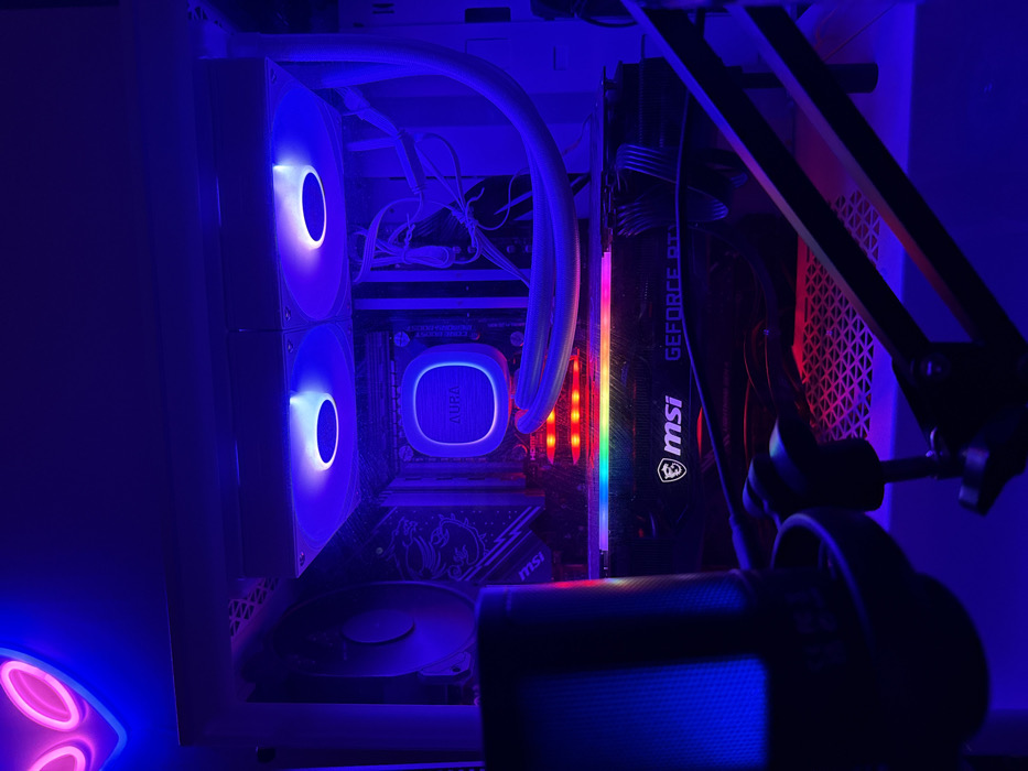 The scene depicts an indoor environment in Burgas, Bulgaria, characterized by low ambient light and prominent digital illumination. A desktop computer tower, featuring a transparent side panel, is the central subject, internally lit with various RGB components. Within the tower, an MSI GEFORCE RTX graphics card displays a multi-color LED strip. Above it, a CPU liquid cooler with "AURA" branding emits a white and blue light from its circular pump head. Two top-mounted cooling fans glow with blue and purple light, and a single rear fan is also illuminated. White liquid cooling tubes are visible, connected to the CPU cooler. In the upper-left corner of the frame, a neon sign in the shape of an alien head emits pink and blue light. A dark-colored microphone on a boom arm is positioned in the foreground, partially obscuring the lower-left section of the computer tower. No individuals are present.