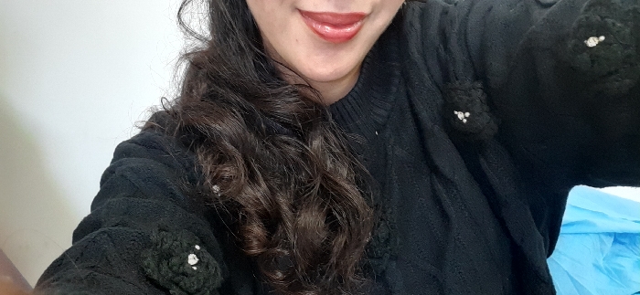 This close-up image, taken in an unknown indoor location in Meknes, Morocco, features the upper torso and lower face of an individual, likely female, captured from a slightly upward angle. The subject's dark, wavy hair cascades down the chest and shoulders. The visible portion of the face shows the mouth, with lips coated in glossy red or reddish-pink lipstick, slightly parted. The subject wears a dark, possibly black, knitted garment, likely a sweater or cardigan, with a ribbed neckline. The garment is adorned with decorative elements, specifically clusters of small, reflective white or silver beads/sequins arranged in groups of two or three, appearing on textured appliqués on the left shoulder and chest area. The background consists of a plain white wall, with a vibrant blue object, possibly fabric, visible in the lower right corner. No other people or discernible actions are present.