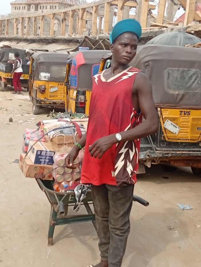 A man stands next to a wheelbarrow loaded with boxes and cans of drinks. He wears a red and brown sleeveless shirt, dark pants, a blue cap, and a watch. The background features a dusty street with several yellow auto-rickshaws and a partly constructed building in the distance. The man is looking to his right. A pair of sunglasses is hanging from the wheelbarrow.
