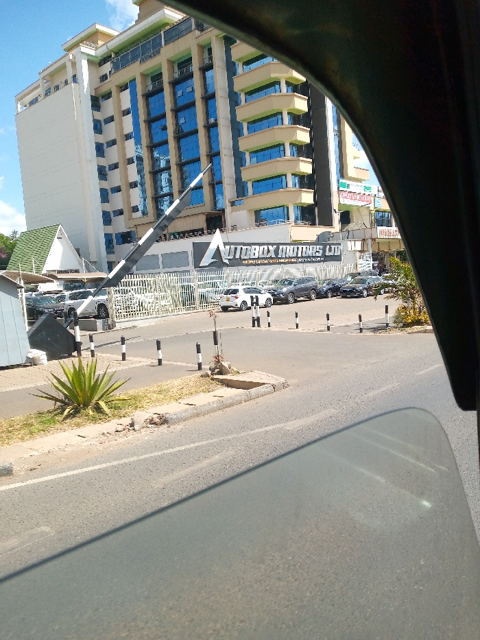 The image depicts an urban street scene observed from within a vehicle, indicated by the dark, curved frame on the right and bottom edges. In the background, a multi-story building dominates, featuring a light-colored facade on its left section and a modern, blue-windowed section with light green/yellow balcony railings on the right. At ground level, a prominent sign identifies "AUTOBOX MOTORS LTD" above parked vehicles, including a white SUV, a grey SUV, and darker cars, arranged behind a white metal fence and on an adjacent paved lot. A black and white striped boom gate arm is angled upwards on the left, marking an entrance to the "AUTOBOX MOTORS LTD" premises. To the immediate left of the boom gate mechanism, a small grey structure is visible. A narrow strip of grass containing a spiky green plant separates the paved lot from an asphalt road in the foreground. Black and white striped bollards delineate areas on the paved lot. No individuals are visible. The sky is clear blue with some white clouds, indicating daytime conditions.