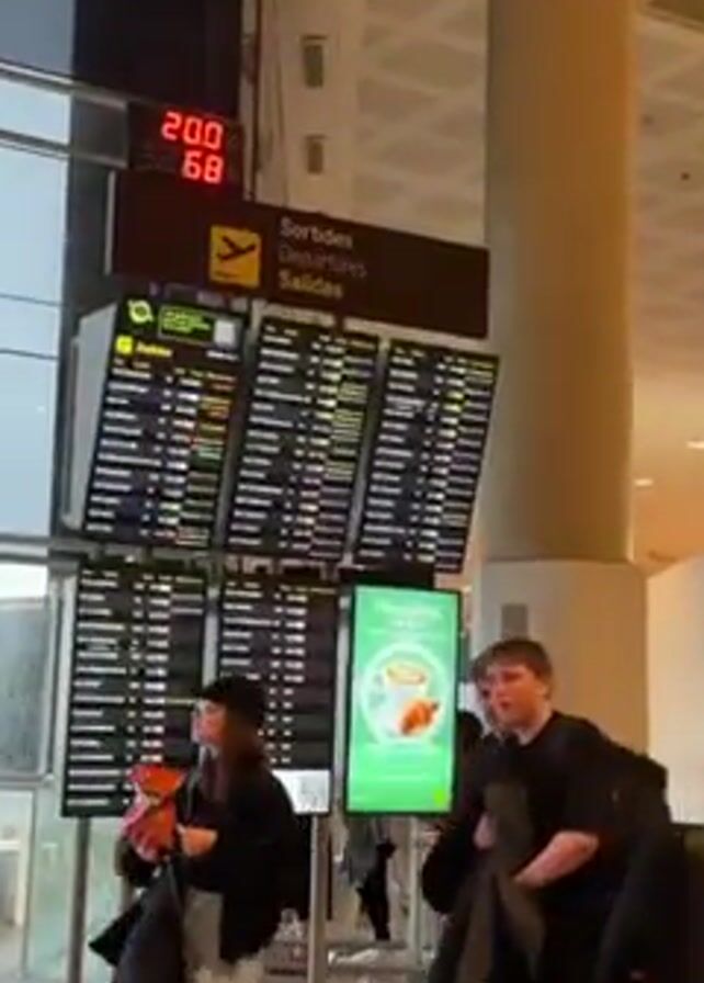 group of people standing in front of a departures board at an airport. The board is displaying flight information, including destinations, flight numbers, gate numbers, and status updates. The people are looking at the board, presumably checking for information about their flights. The airport is modern and well-lit, with a high ceiling and large windows. The floor is tiled. The airport is busy, with people walking around and waiting for their flights. The camera zooms in on the departures board, showing the flight information in more detail.