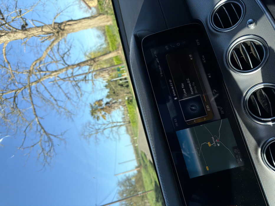 The scene is captured from inside a vehicle, looking forward over the dashboard. The car's infotainment screen displays a navigation map on the left, centered on the location "Cucasse," which is situated within the commune of Mauléon-d'Armagnac, France, specifically showing roads D223 and D114. To the right, the screen shows music playing, identified as "I Love You" by Fontaines D.C. from the album "Skinty Fia," connected via "Iphone de E.C (2)," with 0:55 elapsed of a 4:10 track. The time 09:43 is visible, along with temperature readings of 20°C and 23°C. Below the screen, multiple circular air vents are present. Through the windshield, a narrow, paved road extends straight ahead into a rural landscape. The roadside is lined with green grass and various trees, including mature deciduous trees with bare branches, a palm tree, and other trees with green foliage. Utility poles with overhead lines are visible along the road's edge, under a clear blue sky.