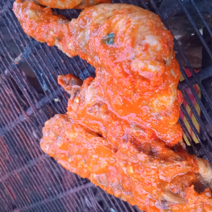 Two large cuts of chicken, likely thighs and drumsticks, are positioned directly on a dark, heavy-gauge metal grill grate. Each chicken piece is thoroughly coated in a vibrant, textured red-orange marinade containing visible specks of what appear to be chili flakes and small green herbs. The marinade adheres thickly to the chicken's surface. A faint yellowish light source is discernible beneath the grill grate, indicating an active heat source. The grill grate itself exhibits dark discoloration consistent with prior use. This food preparation scene is located in Narayi, Nigeria.