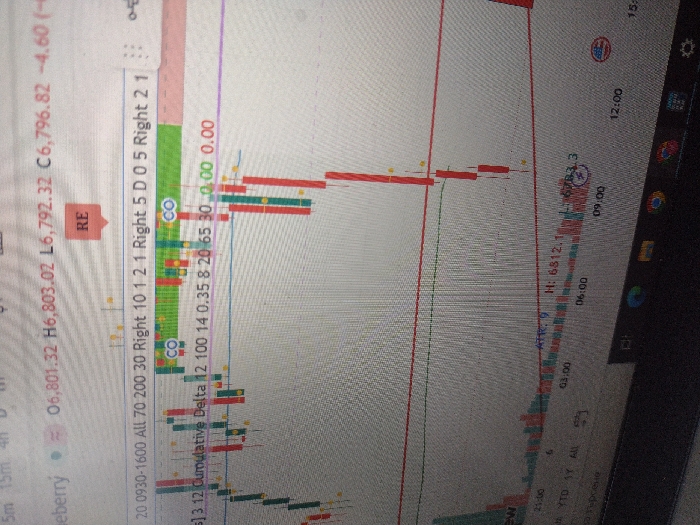 The image displays a close-up, angled view of a laptop screen presenting a financial trading chart. The chart features green/teal and red Japanese candlesticks against a light gray background, indicating price movements over time. Horizontal red and green/teal lines are visible across the chart. Numerical data and text indicators are present at the top and bottom of the chart, including "O6,801.32 H6,803.02 L6,792.32 C6,796.82 -4.60," "RE," "CO," "Cumulative Delta," and "ATR: 9." A time axis at the bottom shows intervals such as "21:00," "03:00," "06:00," "09:00," and "12:00." A significant downward price trend is depicted on the right side of the chart by a series of red candlesticks. The bottom edge of the laptop screen shows a partial view of a Windows taskbar with icons for applications such as File Explorer, Microsoft Edge, Google Chrome, and Settings. Reflections are visible on the screen surface. No individuals or specific actions are depicted. The background beyond the screen is indistinct, suggesting an indoor environment. The image contains no visual information to determine a specific location within the city of Burgas, Bulgaria.