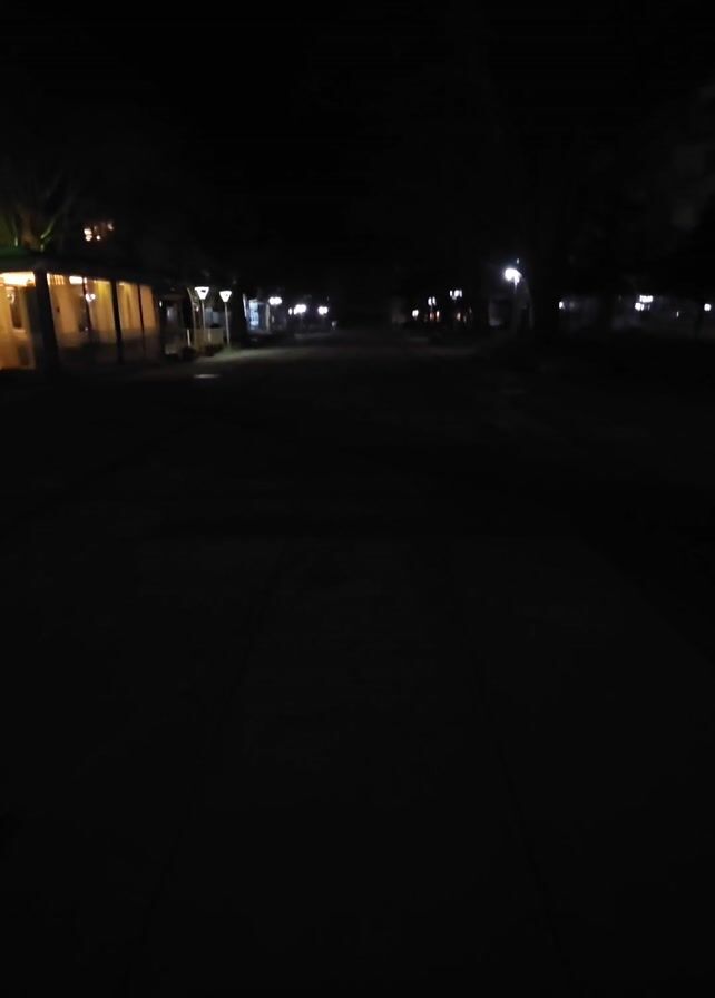 view down a dark street at night