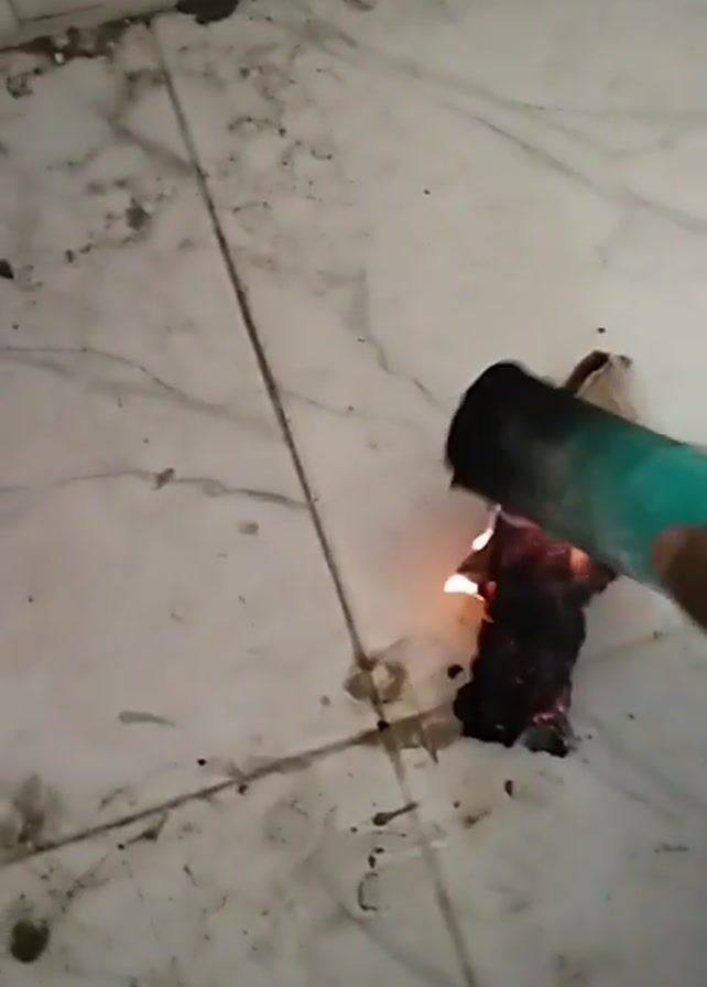 A person holds a small green tube in their hand and uses it to try to smother a small fire on a white tile floor. The fire is black and charred, with orange embers visible. The person's hand is dark-skinned. The floor has several stains and dark spots, and the tiles are cracked with black lines. The person is holding the tube close to the fire and moving it around in an attempt to put it out.