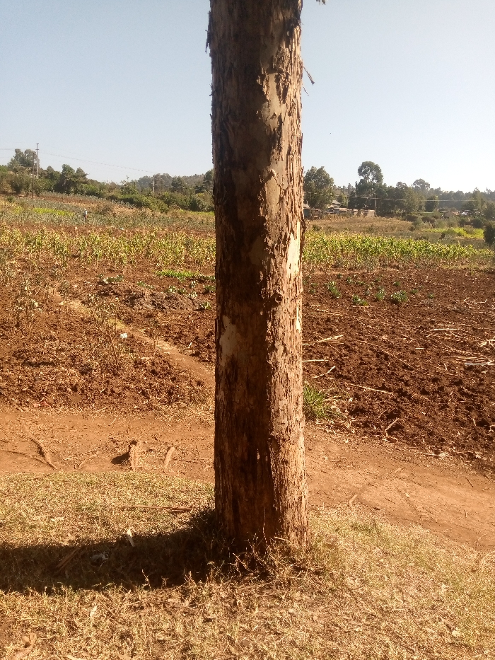 A tall, straight tree trunk dominates the foreground, its bark textured and peeling. The ground around the base is covered in dry grass and scattered leaves. Beyond, a cultivated field stretches into the distance, showing rows of green crops amongst areas of bare brown earth. In the background, a treeline is visible under a clear, bright sky. A dirt path runs along the edge of the field.