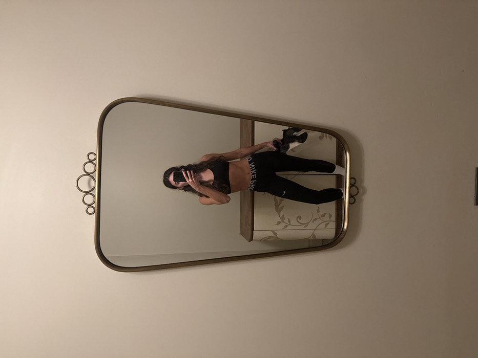 An indoor, mirror-reflected scene depicts a woman taking a selfie within a private residence in Paris, France. The woman, with long dark hair, is visible from the upper chest to mid-shin. Her face is obscured by a black smartphone held in her right hand, positioned to capture the image in a large, ornate brass-framed mirror. The mirror features a distinct, somewhat trapezoidal shape with rounded corners and five decorative brass rings along its top edge. The woman is dressed in black athletic wear, consisting of a sports bra and leggings with "NIKE PRO" displayed on the waistband. She is wearing white ankle socks and holds a pair of black and white athletic shoes in her left hand. Reflected behind her in the mirror is a light-colored console cabinet with a dark wooden top and two doors featuring a subtle, embossed or painted light floral motif. The surrounding wall is a plain, light beige or cream color.