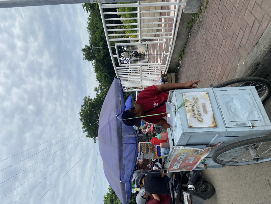 - "A man in a red shirt and blue cap stands by his food cart, which reads "Pemal Goreng" by FM-htxI33, licensed under CC BY 4.0