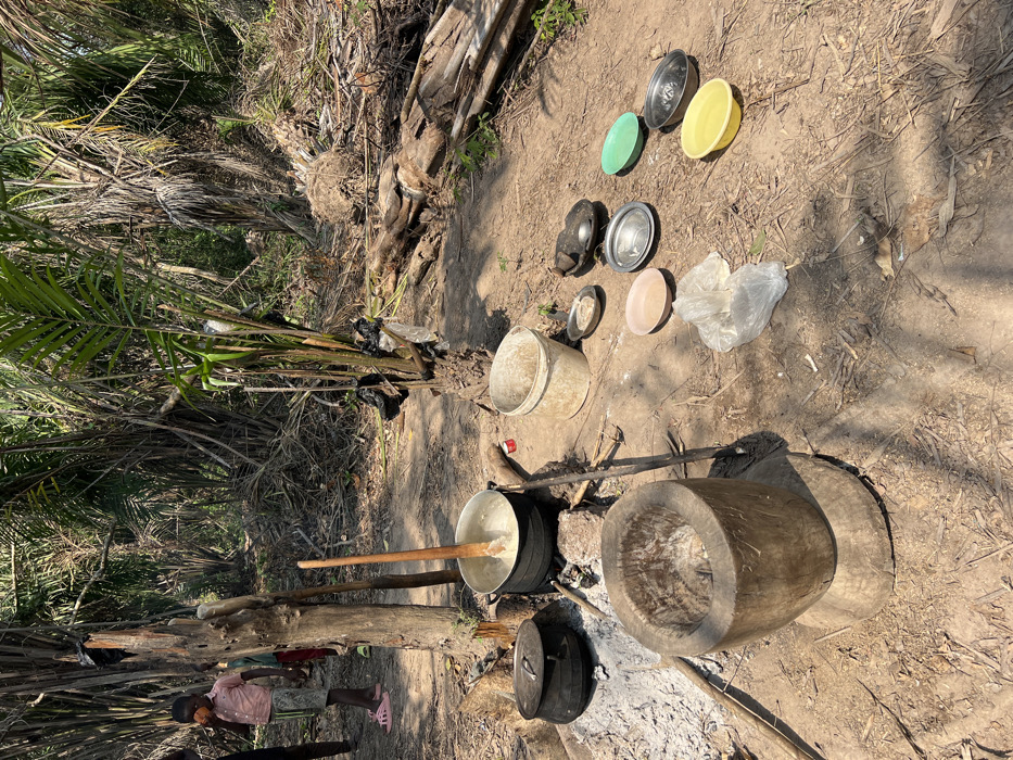 The scene depicts an outdoor cooking and food preparation area within a dense, sunlit tropical environment in Wuinta, Ghana