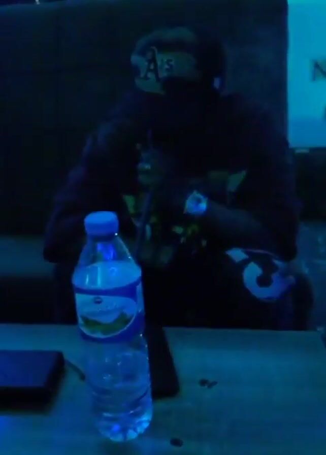 In a dimly lit, likely indoor lounge or club setting, a person is seated on a dark, cushioned bench, illuminated by blue and green lighting. The individual, initially obscured, is wearing a baseball cap and a red long-sleeved shirt with a graphic print on the front. A water bottle with a blue cap sits on a small table in the foreground, beside what appears to be a cell phone. A hookah is partially visible, suggesting that the person might be smoking or preparing to smoke. The background is blurred, but signage and other patrons can be made out. The scene is dynamic, with potential movement and interaction of the person with the surrounding environment.