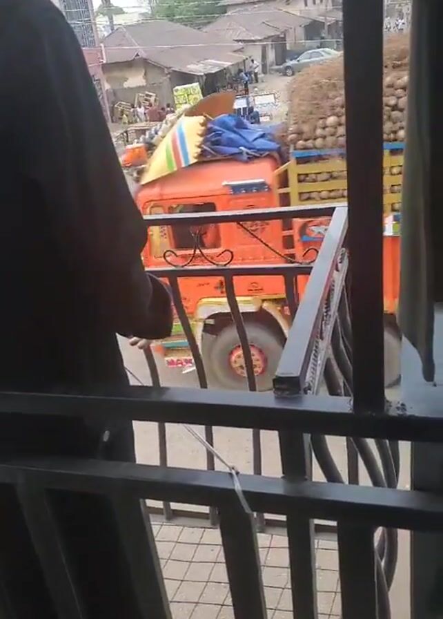 From a slightly elevated position behind a dark metal railing, the video shows an orange truck passing by on a paved street. The truck is heavily laden with what appears to be a large quantity of coconuts or similar round, brown objects. In the background are various buildings, some with light-colored roofs, and a few people are visible on the street. A person wearing a dark garment stands partly in the frame, obscuring some of the view. Laundry is seen hanging overhead. The scene is somewhat hazy or overcast.