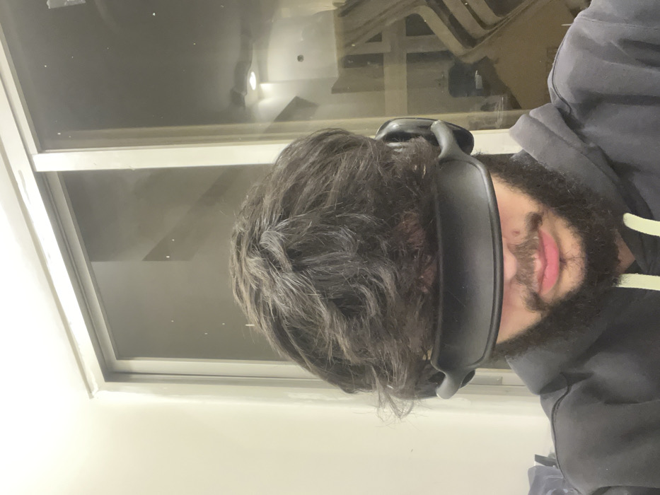 A person with dark hair and a beard wears a black VR headset. The person is wearing a dark hoodie. A window is visible in the background, reflecting the room. The floor is light colored. Some chairs are visible out of focus in the background. The photo appears to be taken indoors with natural light.