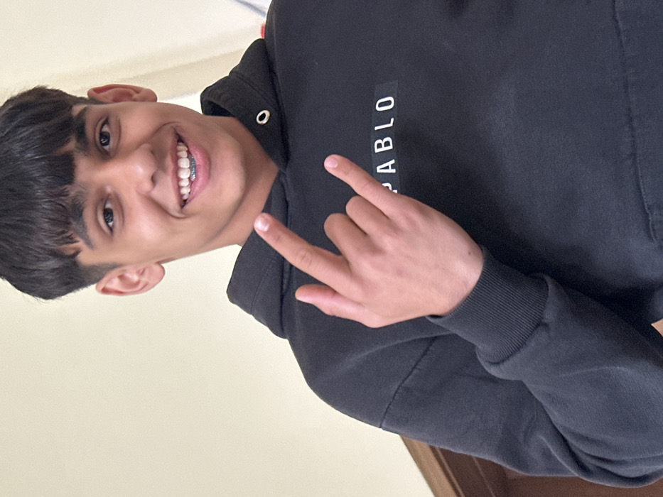 A male individual is depicted in a chest-up portrait, reportedly located in Stara Zagora, Bulgaria. He possesses a medium complexion, dark hair styled with bangs, and is smiling, revealing dental braces on his upper teeth. He wears a dark-colored hooded sweatshirt featuring "PABLO" in white capital letters on a dark rectangular patch on the chest. His right hand is raised to approximately chest height, forming a 'rock and roll' gesture with the index and pinky fingers extended and the other fingers curled. The background consists of a plain, light-toned wall, with a segment of dark wooden trim or a door frame visible on the left side of the frame.