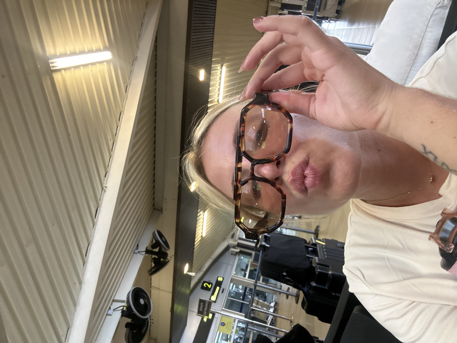 A light-skinned woman holds brown-framed sunglasses in front of her face, puckering her lips. She's wearing a light-colored shirt and a delicate necklace. Her blonde hair is pulled back. The background shows what appears to be an airport terminal, with baggage, signage, and speakers attached to the ceiling. Natural and artificial light illuminates the scene.