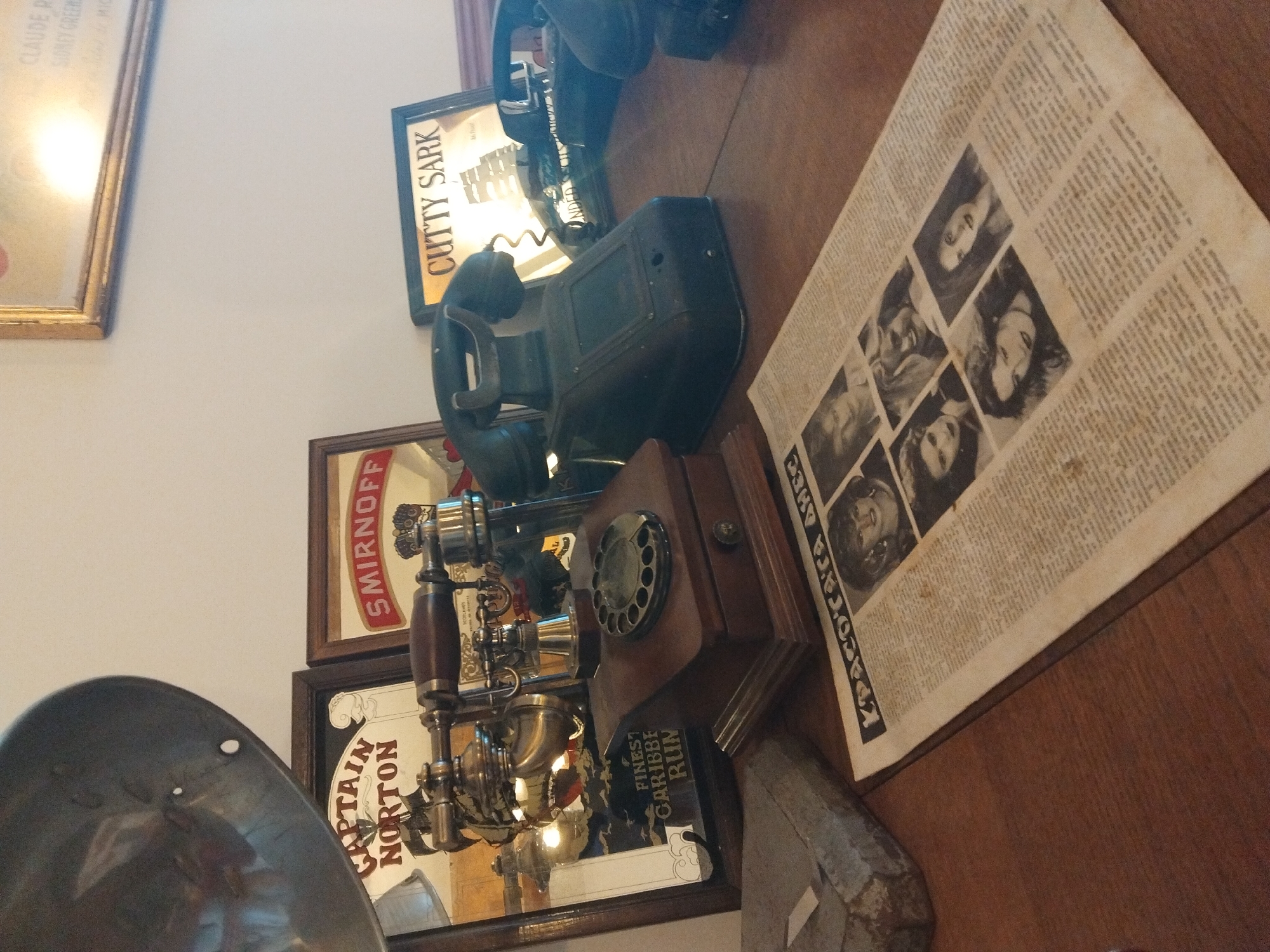 The scene displays an assortment of antique objects arranged on a table, likely in Asenovets, Bulgaria. Included are vintage telephones, a newspaper featuring portraits, and framed advertisements for brands such as Smirnoff, Cutty Sark, and Captain Norton's Finest Caribbe Run. There are also framed mirrors reflecting the items. The light in the scene appears dim and potentially artificial.