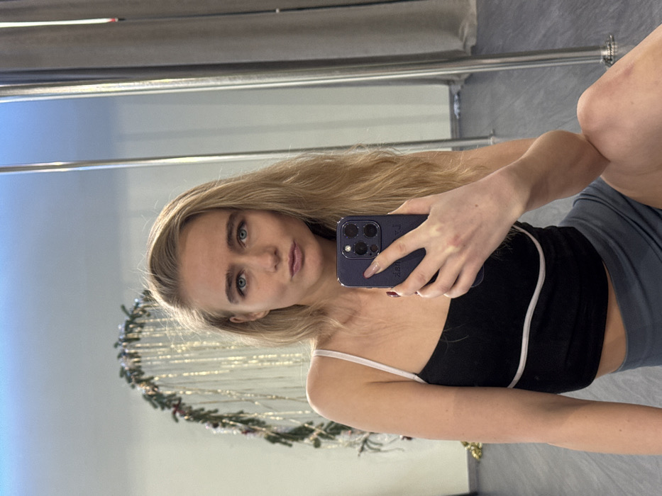 A female subject is depicted taking a mirror selfie in what appears to be a fitness or dance studio located in Unknown, Unknown