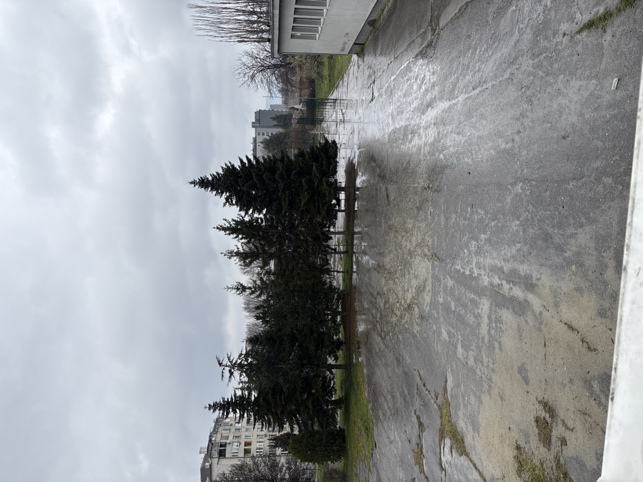 The image displays an outdoor, urban-suburban scene in Varna, Bulgaria, under an overcast sky. The foreground consists of an uneven, cracked, and extensively wet asphalt or concrete surface, exhibiting numerous puddles and patches of green vegetation growing through fissures. A white horizontal barrier or railing occupies the bottom edge of the frame. In the midground, a dense line of approximately ten dark green evergreen trees stands, partially separating the paved area from a patch of damp grass behind them. Beyond this line of trees, a metal fence is visible, leading to an open area with bare deciduous trees and distant structures. The background on the left features a multi-story residential building with numerous windows and balconies, partially obscured by the evergreen trees. On the right, a light-colored, two-story building with four rectangular windows on its visible side stands. Faint Cyrillic text, appearing to read "ВАРНА СИМ", is visible on this building's exterior wall. Tall, bare deciduous trees are also present in the background on the far right. No human figures or discernible activity are present in the scene. The sky is uniformly grey and cloudy, indicating diffuse lighting conditions.