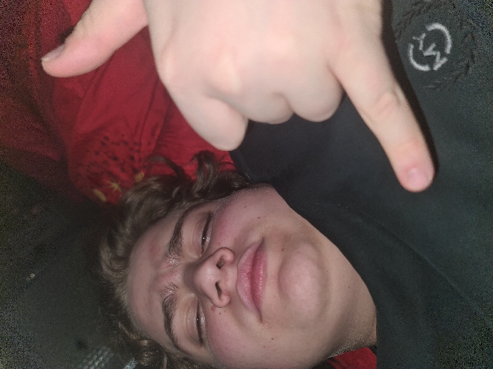 A person lies tilted, face prominent, with eyes partially closed and lips pursed. A hand partially obscures the upper portion of the image, its index finger pointing downward. The person wears red clothing on the left and a dark, possibly black, garment on the right, bearing a small white logo. The background appears to be a textured, dark surface.