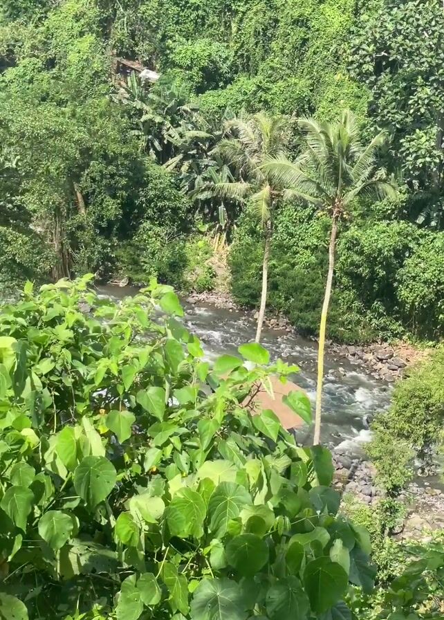The video pans upward to reveal a waterfall in a lush, green, tropical environment