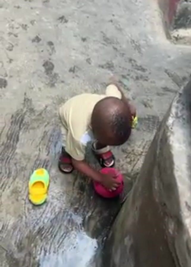 A small Black child plays with a pink ball on a wet concrete surface. The child wears a tan collared shirt, dark shorts, and dark sandals. Bright yellow and green sandals are on the ground near the child. The child pushes the ball with both hands near a concrete wall, then looks up towards the camera. The concrete surface has dark stains. A reddish-brown wall and a round concrete basin are also visible.