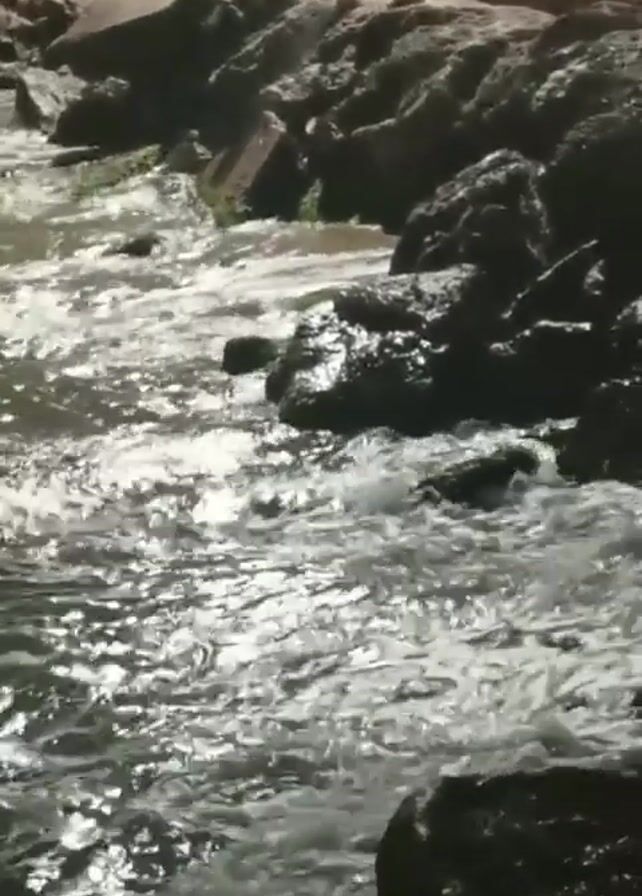 The video depicts water, likely from a body of water like a sea or ocean, crashing against a rocky shore at night. The waves are small, and the water has a silver glint from reflected light. The rocks are dark and covered with patches of green moss or algae. A concrete edge or walkway is visible in the background, suggesting a built environment nearby. The scene is illuminated by artificial lights, creating a stark contrast between the dark rocks and the shimmering water.