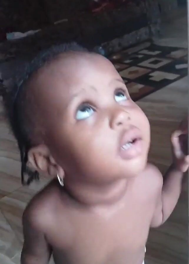 A young, dark-skinned baby stands indoors wearing a diaper. The baby is looking upwards in the first two frames of the video. The baby then reaches for the camera and waves. There is a rug on the floor and a couch in the background.