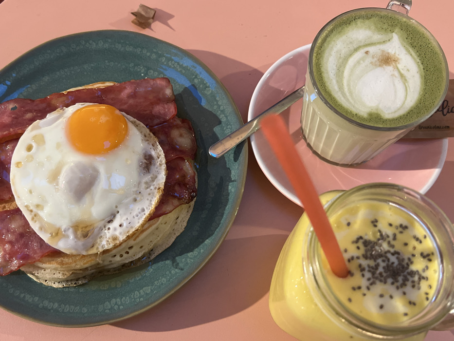 The scene depicts a breakfast or brunch arrangement on a light pink table in an indoor setting, located in Aldoar, Foz do Douro e Nevogilde, Portugal. Centrally positioned on a teal ceramic plate is a stack of four to five pancakes, topped with multiple strips of lightly cooked bacon and a single sunny-side-up fried egg, its yolk a prominent orange. To the lower left, a glass jar holds a yellow smoothie, garnished with numerous black chia seeds, and contains an orange plastic straw. To the lower right, a ribbed clear glass mug, placed on a pink saucer, contains a green matcha latte adorned with white, intricate latte art. A silver spoon rests on the saucer next to the mug. A small, crumpled piece of brown paper is visible on the table surface near the upper right edge of the frame. No individuals are present. The lighting suggests an overhead source, casting soft shadows.