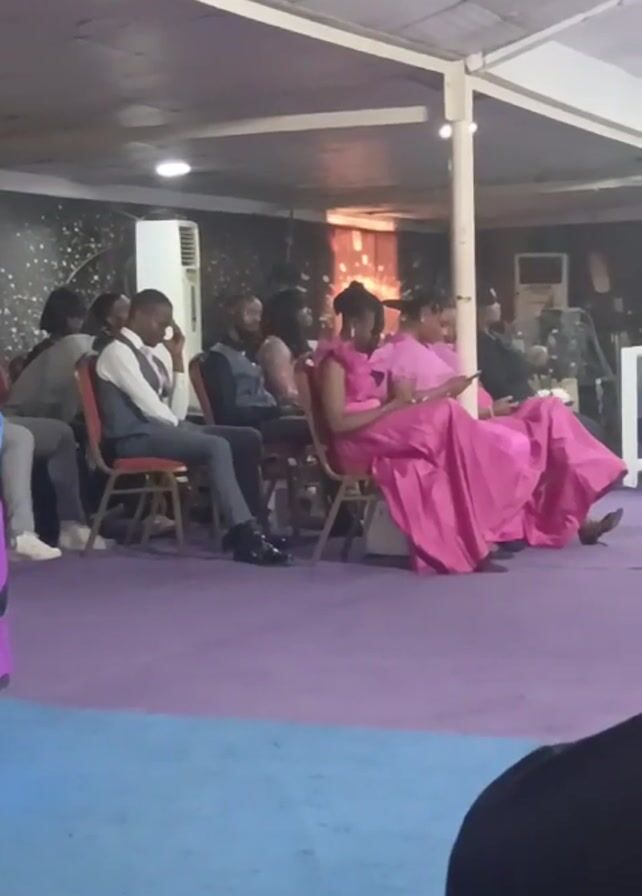 small group of people seated on red and brown chairs indoors. The room has a low white ceiling with visible beams, and the floor is divided into blue and purple sections. On the left side, a man in a gray suit vest appears to be in deep thought. To his right, another man in a similar suit is looking straight ahead. Two women are seated on the right; both are wearing long, bright pink dresses. One of the women is looking at a mobile phone in her hands. An air conditioning unit is visible in the background, along with a mirror. The scene appears to be part of a meeting or gathering.