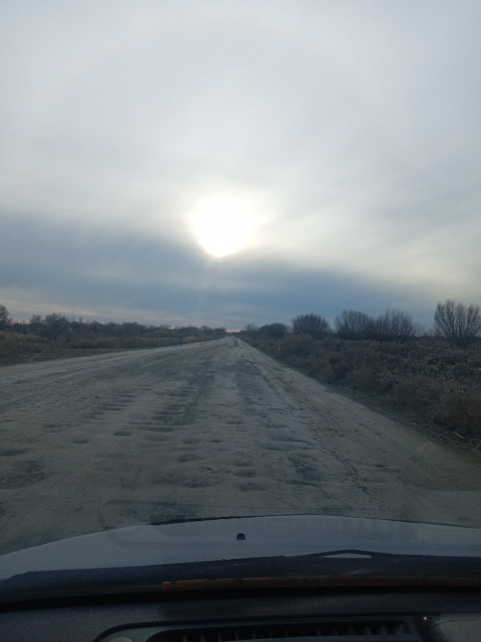 The scene, set in Stanakov, Uzbekistan, is observed from inside a vehicle looking forward along a severely degraded, unpaved road. The road surface exhibits extensive, roughly circular indentations and ruts, forming a washboard-like pattern that extends into the distance. Sparse, leafless vegetation, consisting of low trees and bushes, borders both sides of the road, appearing denser on the right. The sky is overcast with a bright, partially obscured sun visible through the clouds in the upper-left quadrant, diffusing light across the landscape. A subtle pinkish-orange hue is present along the distant horizon. The immediate foreground shows the vehicle's dashboard and the base of a windshield wiper. No people or animals are visible.