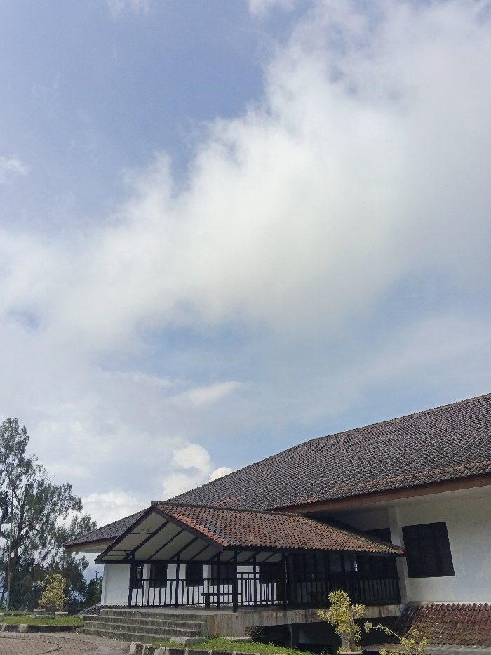 A building with a dark tiled roof fills the lower right of the frame against a bright sky with scattered white clouds. The building is white with dark-framed windows. An open porch with a smaller tiled roof extends from the building, supported by white columns. Trees are visible to the left, and paved ground extends around the building. The image captures a clear, sunny day with the building prominently featured.