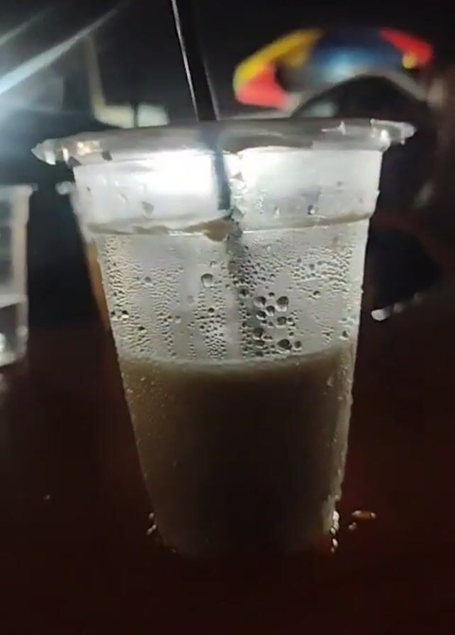 A close-up video shows a plastic cup filled with a light brown liquid, likely a beverage, sitting on a dark surface, possibly a table