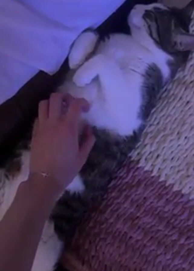 A short, high-angle shot shows a hand petting a reclining cat's white belly