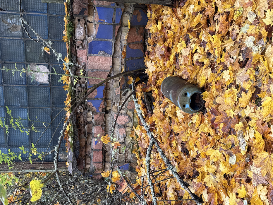 The image depicts a static outdoor scene in Prypiat, Ukraine, characterized by urban decay and autumnal overgrowth. The foreground is entirely covered by a thick layer of fallen leaves, predominantly yellow and orange, with some brown and reddish hues. Resting horizontally on these leaves is a weathered, dark bronze or rusted metal cylindrical object, approximately 30-40 cm in length. Its visible end is open, revealing a dark interior, and two small, dark circular indentations are present on its upper surface, creating a resemblance to a stylized face. In the midground, a decaying brick wall is visible, constructed of reddish-brown bricks. Portions of the wall are covered with irregular patches of square blue tiles, many of which are broken, cracked, or missing. Moss and lichen growth is apparent along the top edge of the wall. Above the wall, a window assembly features multiple square glass blocks. Some blocks are intact, while at least one central block appears shattered or absent. Bare tree branches, many covered in grayish-white lichen, extend across the lower and central portions of the frame. Sparse green foliage is visible in the upper left quadrant. No human figures or active elements are present. The environment conveys a sense of abandonment and natural reclamation.