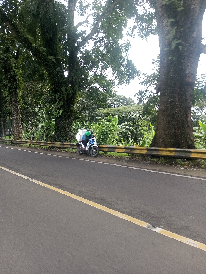 A motorcycle with a person in a green helmet is parked on the side of a road. The motorcycle has a white box attached to its back. The road has a yellow dividing line and is bordered by a yellow and black guardrail. Behind the guardrail is dense greenery, including tall trees, some with hanging vines. The weather appears overcast.