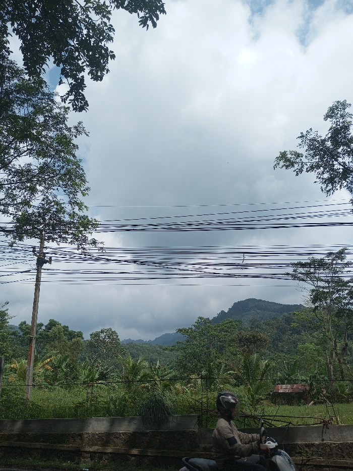 A rural scene depicts a person on a scooter riding on a road separated from a lush landscape by a low concrete barrier. The backdrop features dense green foliage covering a hill and trees lining the roadside. Overhead, a network of power lines stretches across the view, partially obscuring a cloudy sky framed by tree branches in the upper corners. A utility pole stands on the left.