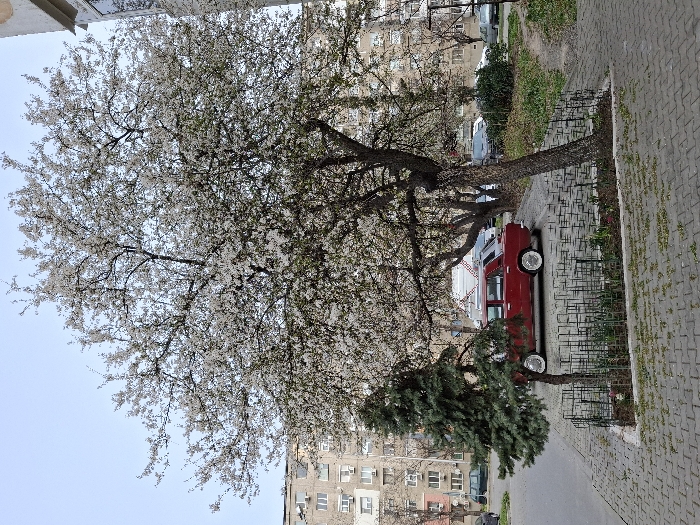 The image depicts an urban outdoor scene in Stara Zagora, Bulgaria, under clear daylight. In the foreground, grey interlocking pavers form a pathway or parking surface. A small, dark green evergreen tree stands to the left, adjacent to a large deciduous tree heavily laden with white blossoms, indicating spring. Both trees are situated within a low, dark metal wire fence that encloses a small, sparse garden bed. A dark red sedan, possibly a Lada model, with prominent white hubcaps, is parked on a paved area behind the evergreen tree. Further back, several other vehicles, including a white van and dark passenger cars, are parked along what appears to be a street or residential parking zone. In the background, multi-story concrete residential buildings with numerous windows and balconies are visible. Some balconies feature external air conditioning units. No individuals are present in the scene. The overall environment suggests a residential district.