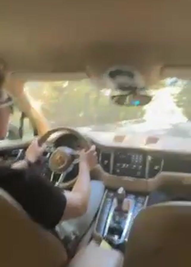A point of view shot inside of a car shows a young man driving on a sunny day. The vehicle is a Porsche Macan with a tan leather interior. The driver is wearing sunglasses, a black t-shirt, and light wash jeans. He has his hands on the steering wheel, navigating a narrow road lined with trees. Music is audible. A passenger is seated beside the driver, but only a portion of their leg is visible. The camera angle and car movement is slightly jerky, likely from being hand-held in the passenger seat.
