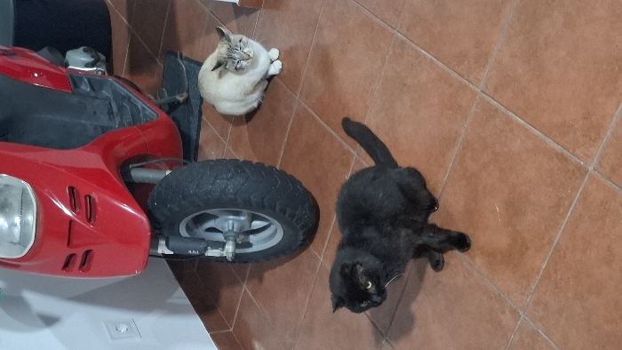 A red toy scooter with a large black tire sits on a tiled floor. Two cats are nearby. One cat is light tan and lying down, while the other cat is black and looking upwards. The flooring appears to be a dark reddish-brown color.