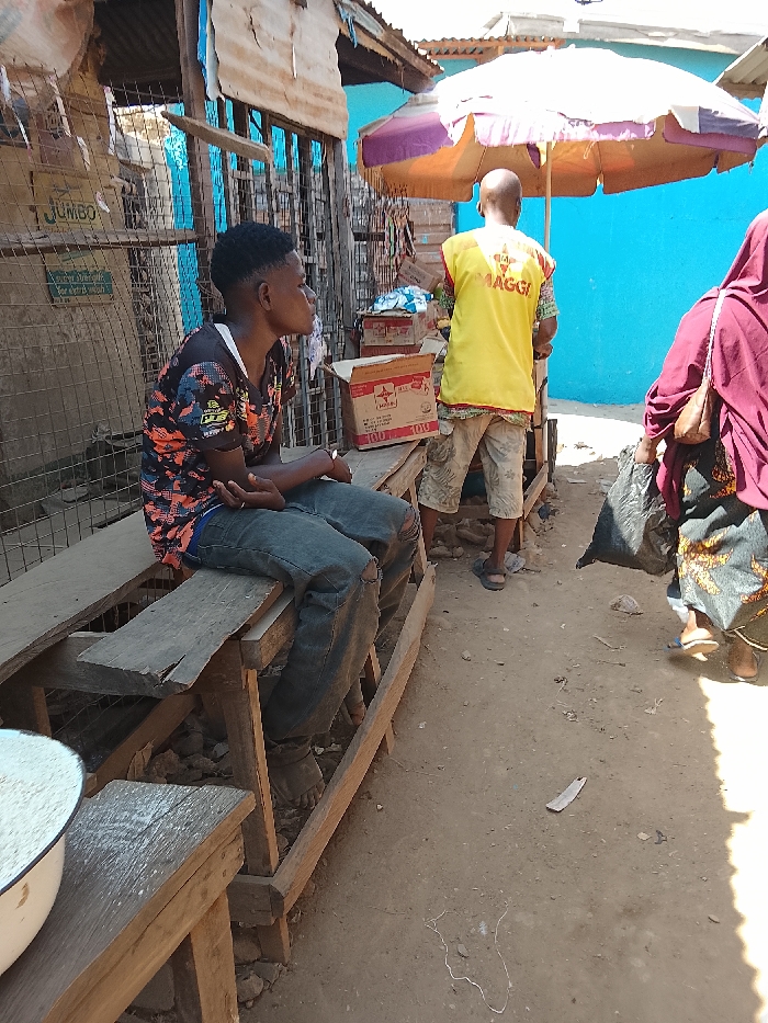 A young man sits on a weathered wooden bench in an outdoor market. He wears a patterned shirt and ripped jeans, gazing off to the side. A Maggi vendor in a yellow vest stands beside a table under an umbrella. A woman in a maroon hijab walks past, carrying a black plastic bag. The setting includes simple stalls, metal wire fencing, and a dirt ground, creating a bustling yet humble atmosphere.