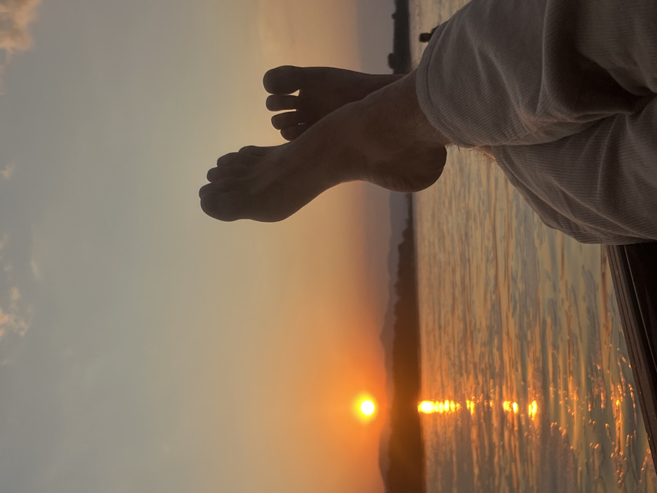 Bare feet dangle in front of a sunset over water. The golden sun is low on the horizon, casting a bright reflection that ripples across the surface. Part of a person's legs, clothed in white pants, are visible on the right. Hazy mountains are faintly visible on the horizon.