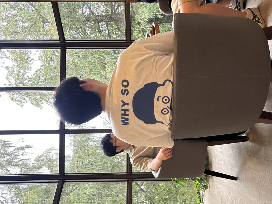 The image depicts an indoor scene, likely a cafe or restaurant, located in the general area of Yuanshan, Taiwan. Three individuals are present. In the foreground, a person with dark hair is seated in a grey upholstered chair, viewed from behind. They wear a light grey short-sleeved t-shirt with a blue graphic on the back depicting a cartoon head in a beanie with wide eyes, captioned "WHY SO" in blue capital letters above the graphic. To their left, a second individual is partially visible, also seated in a similar grey chair, wearing a light beige collared shirt and glasses. Their left arm rests on the chair's armrest. On the right, the legs of a third individual are visible, wearing light-colored shorts and white sneakers with black stripes. All individuals are seated, facing generally towards a large, multi-pane window that forms the entire background. The window frames are dark, and beyond them, an outdoor environment with abundant green trees and foliage is visible under what appears to be overcast or diffused lighting conditions. The interior features a light wood-patterned floor and a potted green plant near the window on the left. A dark wooden table is partially visible between the central foreground figure and the figure on the right.