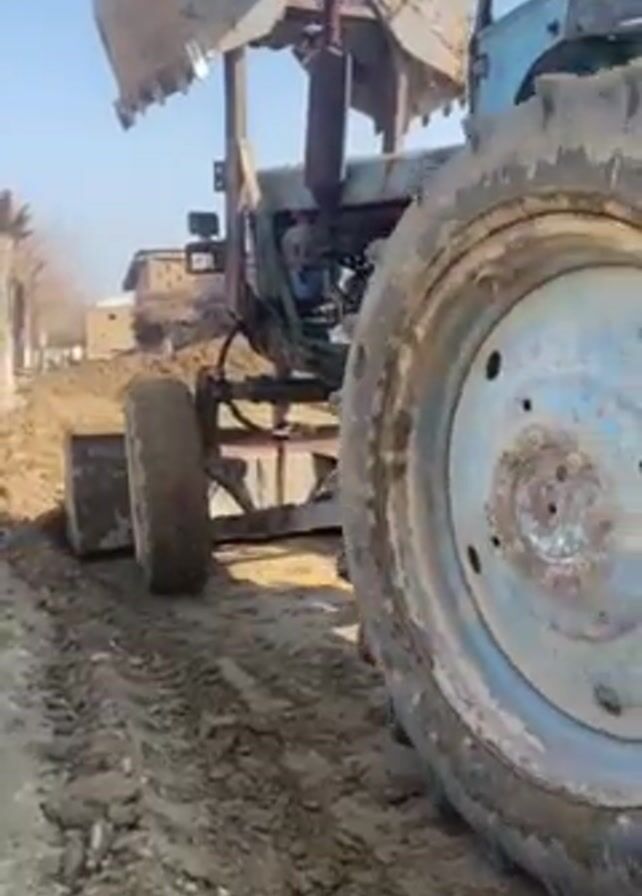 blue tractor moving along a dirt road or path. The tractor has large, muddy tires. It also has a metal blade or leveler attached to the front and a mechanical arm with a bucket on top. The tractor appears to be working on the road, possibly leveling it or clearing dirt. The background shows a clear blue sky and a few buildings in the distance.